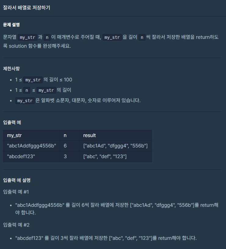 배열의 길이를 지정해 주기 위해 먼저 if문으로 설정해 줬다. 만약 my_str을 n으로 나눴을 때 딱 떨어지면 그 몫을 배열의 길이로 사용하면 되고, 나눠 떨어지지 않는다면 나눈 몫에 +1을 해줘서 크기를 지정해 줬다. 그 뒤 for문으로 길이만큼 반복시켜 주고 조건을 걸었다. 만약 my_str의 길이가 n보다 크거나 같으면 answer배열의 i번째에 my_str를 0부터 n번까지 잘라서 집어넣어 줬다. 그 뒤 my_str에는 자른 나머지를 다시 대입해 줬다. 만약 my_str의 남은 배열의 길이가 n보다 작으면 my_str에 남은 모든 수를 넣어준 뒤 반환했다.