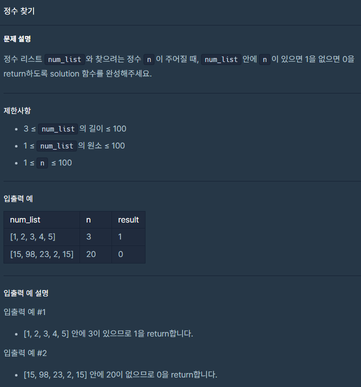 간단한 문제였다. num_list의 길이만큼 반복해 주고 각 원소의 값이 n과 일치하면 answer에 1을 넣어줬다.