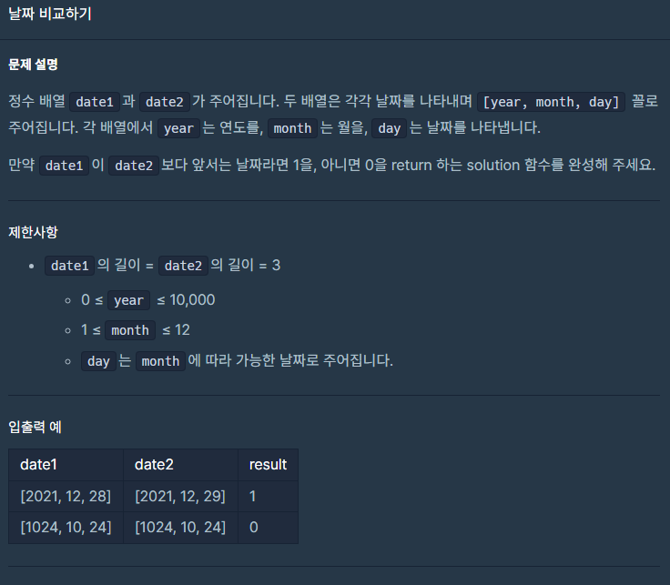 각각의 원소를 비교했다. 기본값을 0으로 두고 만약 date1의 연도값이 더 작으면 1을 리턴하고 크면 0을 리턴했다. 여기서 걸리지 않으면(값이 같으면) 기본값인 0으로 지속될 것이다. 그 후 월과 일도 차례로 비교하고 아무것도 걸리지 않으면 answer에 0이 담긴 채로 그대로 반환되게 해 줬다.