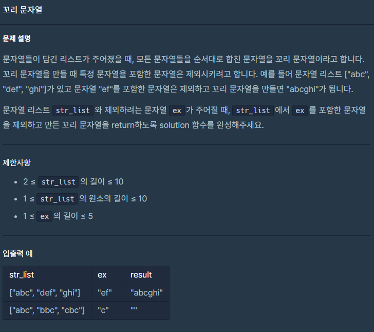 str_list의 길이만큼 반복문을 돌려줬다. 내부에서는 str_list내부에 ex를 포함하고 있으면 continue 시켜줬고, 여기에 걸리지 않으면 answer에 str_list의 값을 추가해 줬다.