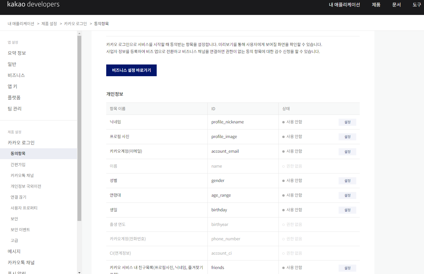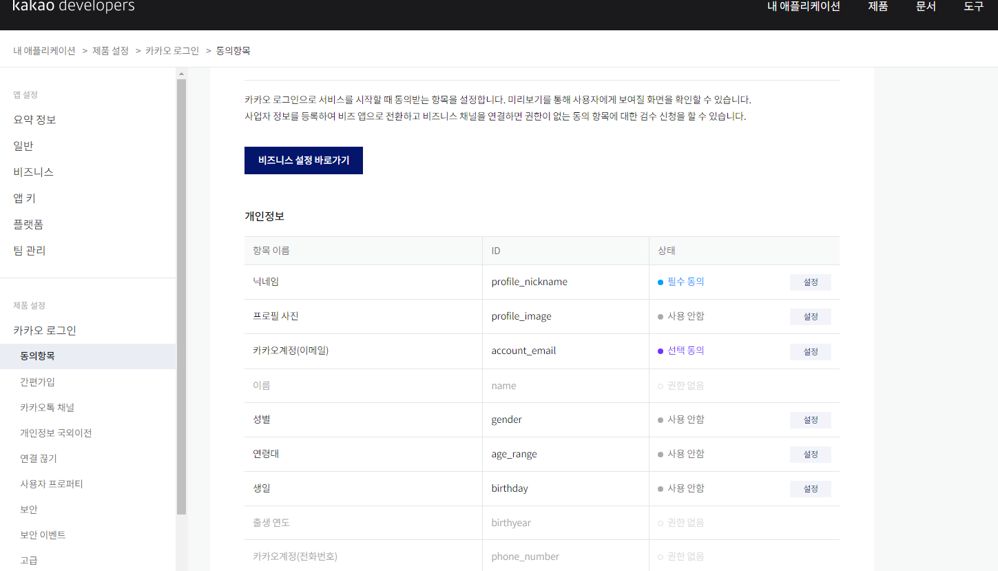 사용자에게 제공받을 개인정보를 활성화시켜준다. 닉네임, 이메일만 가져오면 되기 때문에 두 개를 활성화시켜준다.