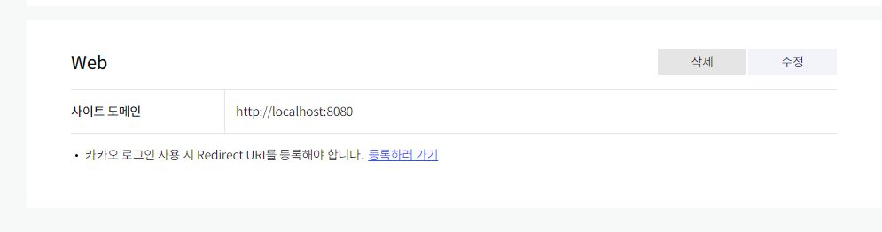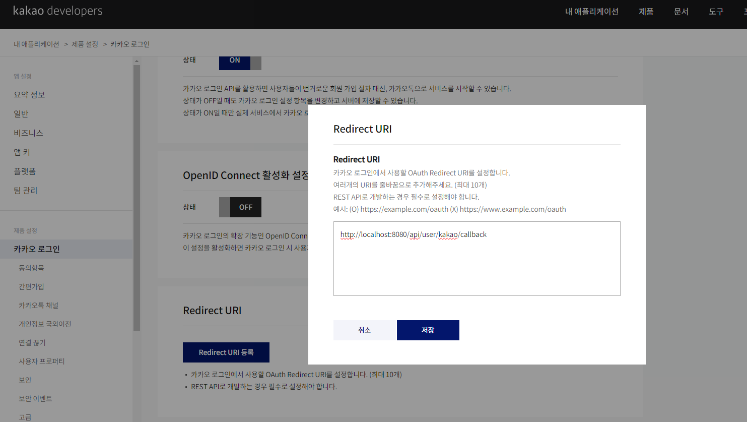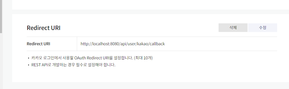 이 부분도 동일하게 우선적으로 로컬에서 수행할 것이기 때문에 넘겨받을 URI주소를 http://localhost:8080/api/user/kakao/callback 이것으로 입력해 줬다. 입력 후 저장을 누른다.