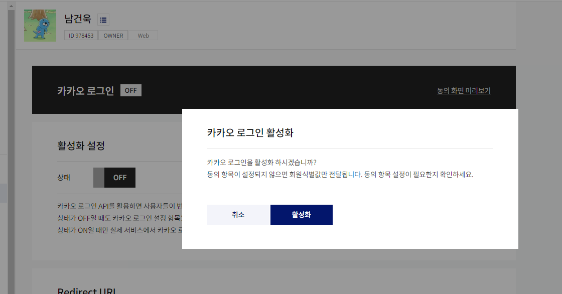 활성화 설정의 OFF를 클릭해 주면 위와 같이 창이 뜬다. 활성화를 눌러준다.