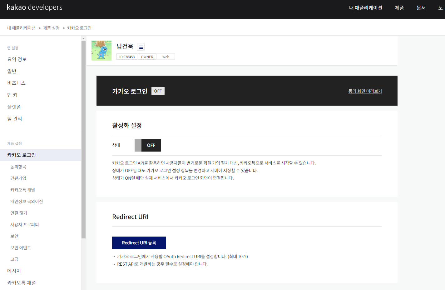 내 애플리케이션 > 제품설정 > 카카오 로그인으로 들어가 준다. 활성화 설정탭에 상태가 OFF 상태이다.
