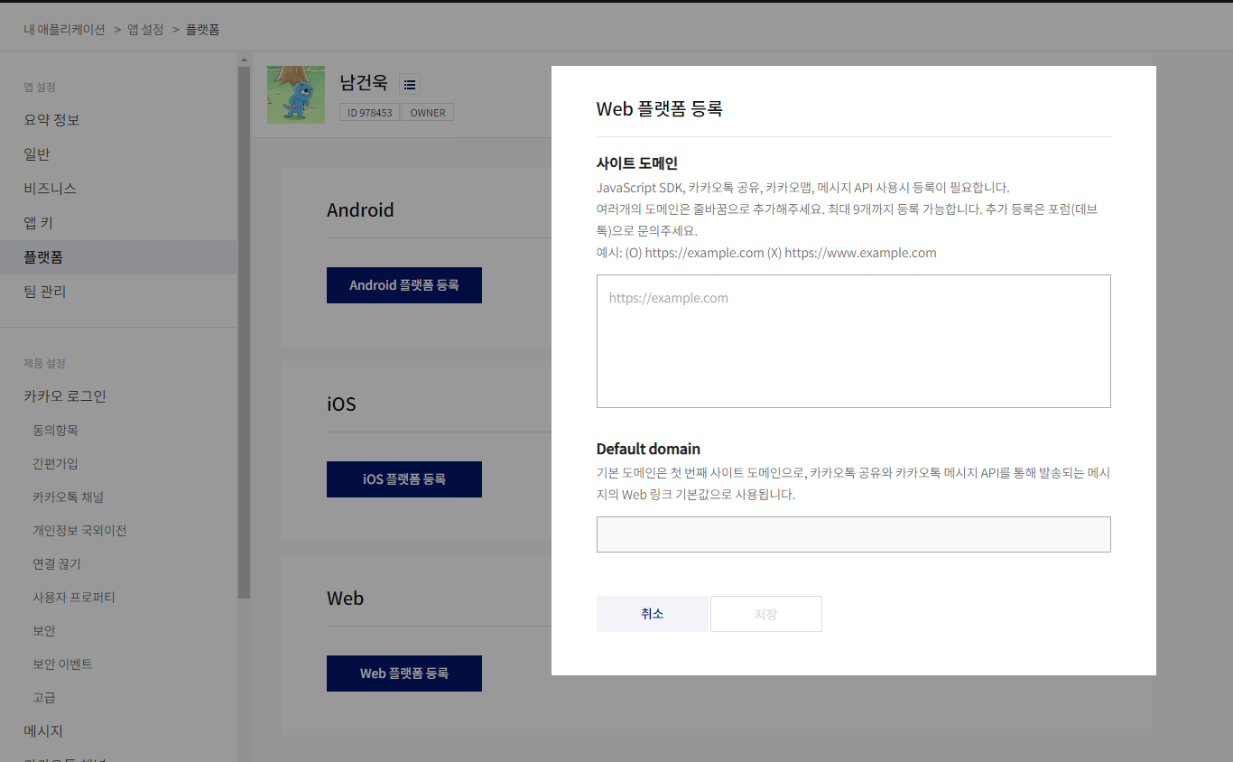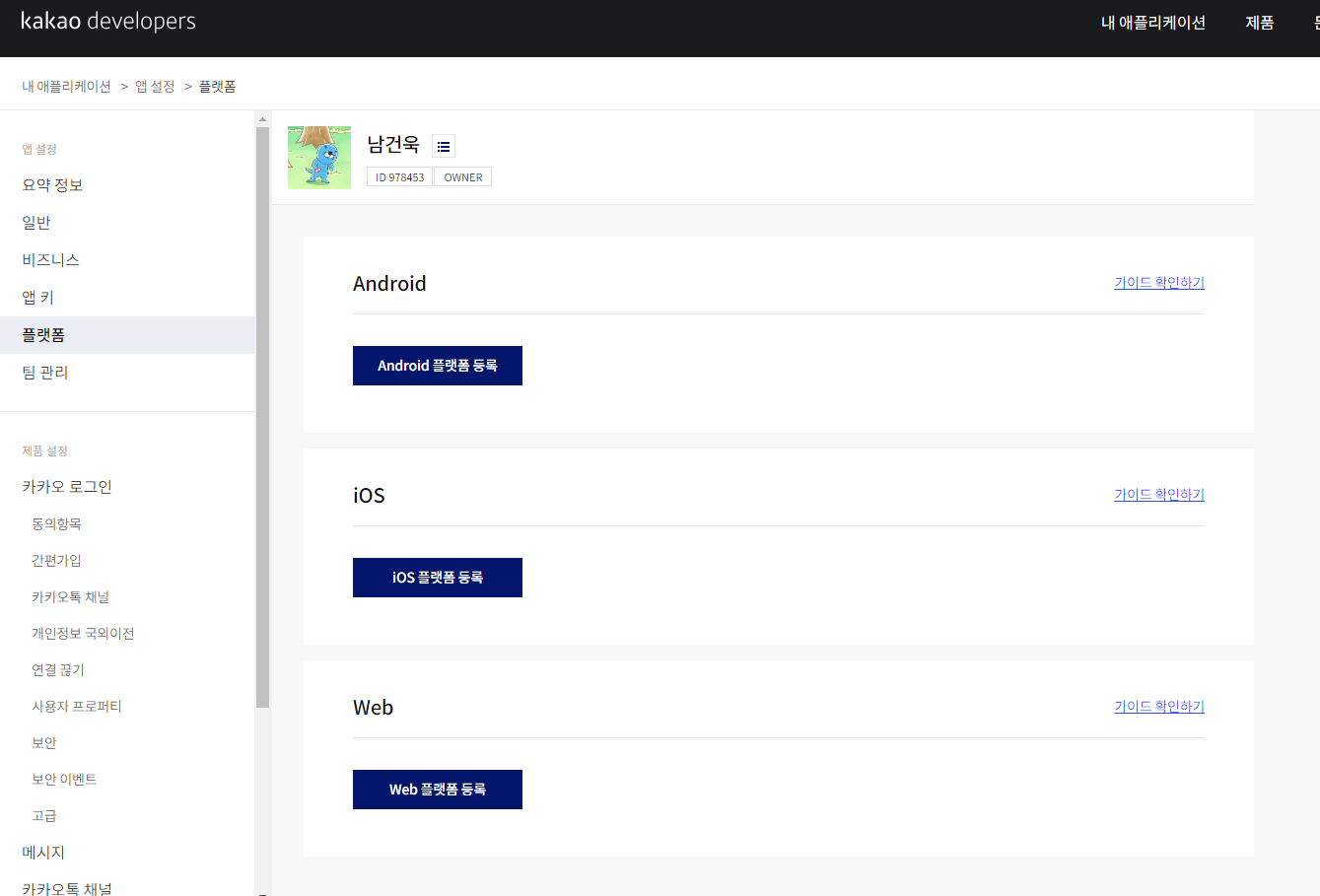 좌측 메뉴 중 내 애플리케이션 > 앱설정 > 플랫폼에 들어와 준다.