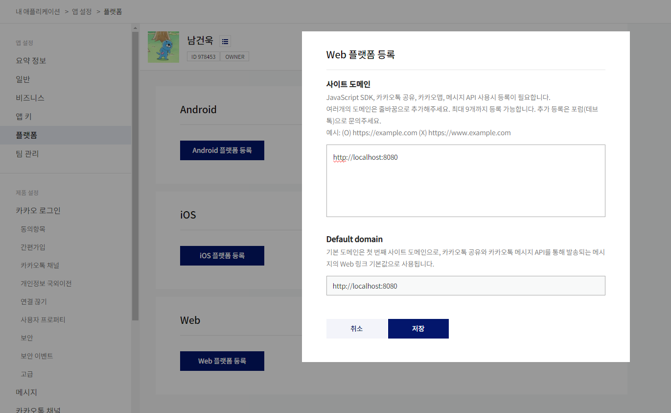 본인의 도메인 주소를 입력해 주면 된다. 우선 로컬환경에서 수행할 것이기 때문에 http://localhost:8080을 작성해 주고 저장버튼을 눌러준다.