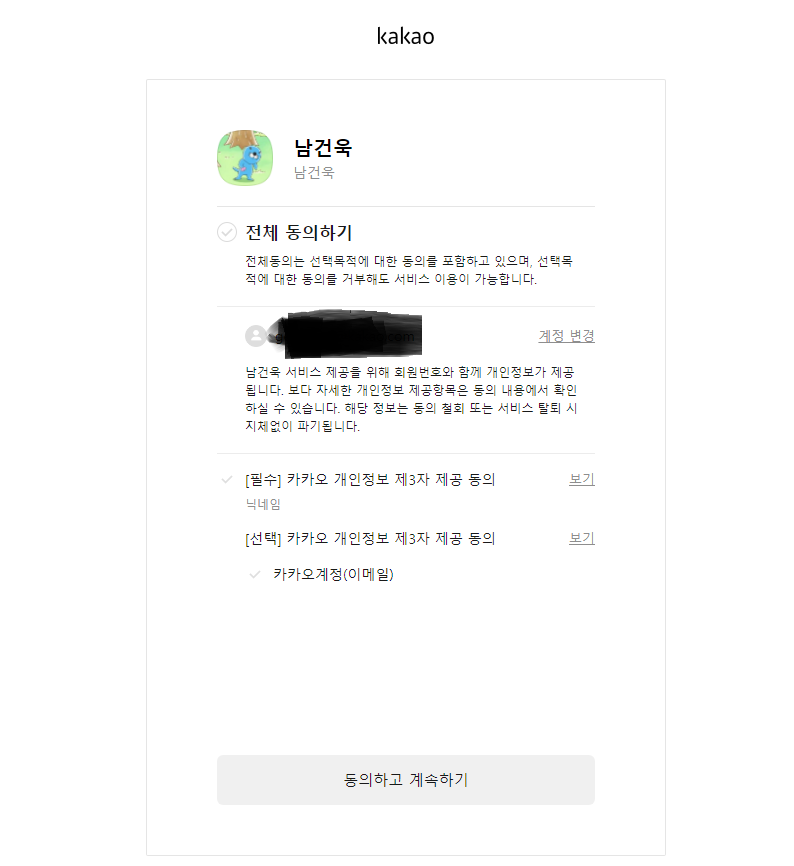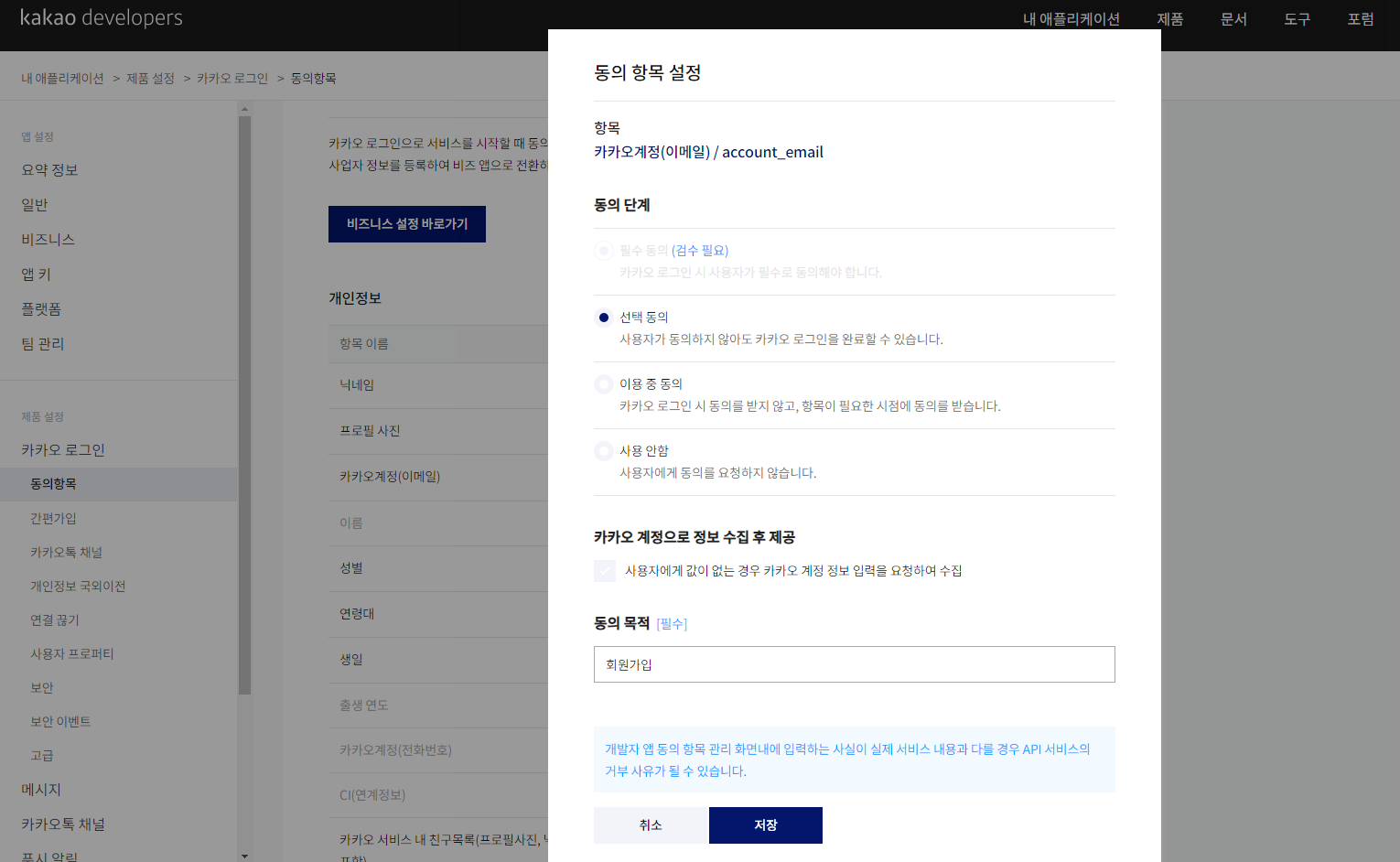 카카오계정(이메일)도 마찬가지로 설정버튼을 눌러주면 다음과 같은 화면이 뜬다. 여기선 선택 동의를 눌러주고 동의 목적에는 본인의 목적에 따른 사유를 작성하고 저장을 눌러준다.