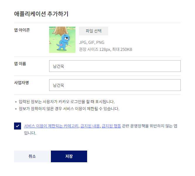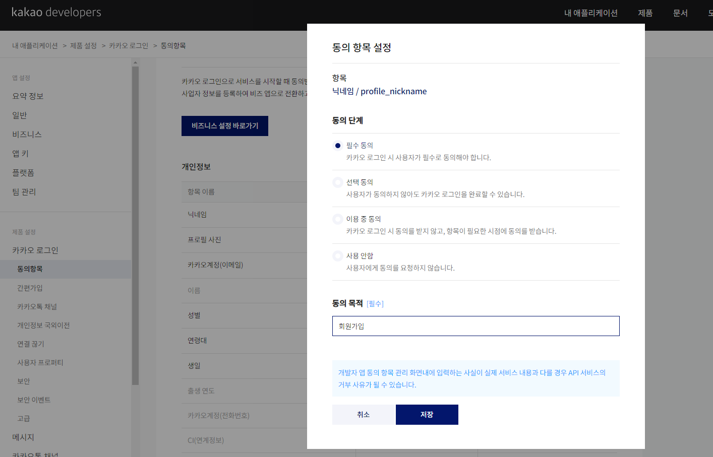 닉네임 오른쪽의 설정 버튼을 눌러주면 다음과 같은 창이 뜬다. 필수 동의를 선택해 주고 동의목적에 자신의 목적에 맞는 동의 목적을 적어준 뒤 저장을 눌러준다.