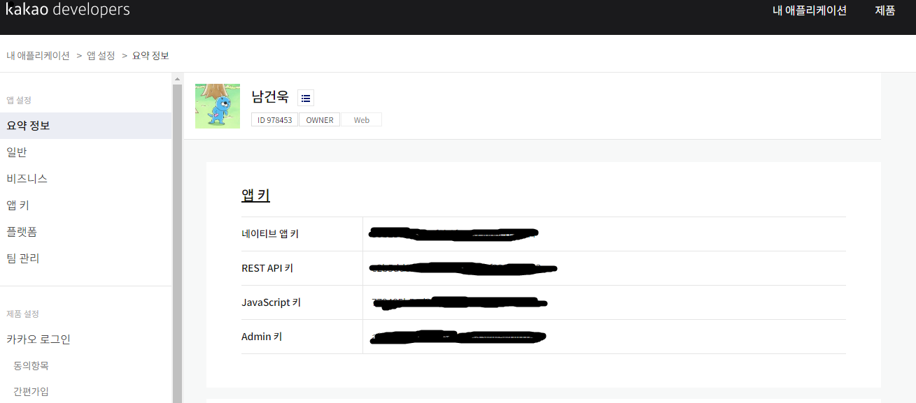 REST API 키 확인법이다. 내 애플리케이션 > 앱설정 > 요약정보에 들어가 주면 나의 REST API키를 알 수 있다.