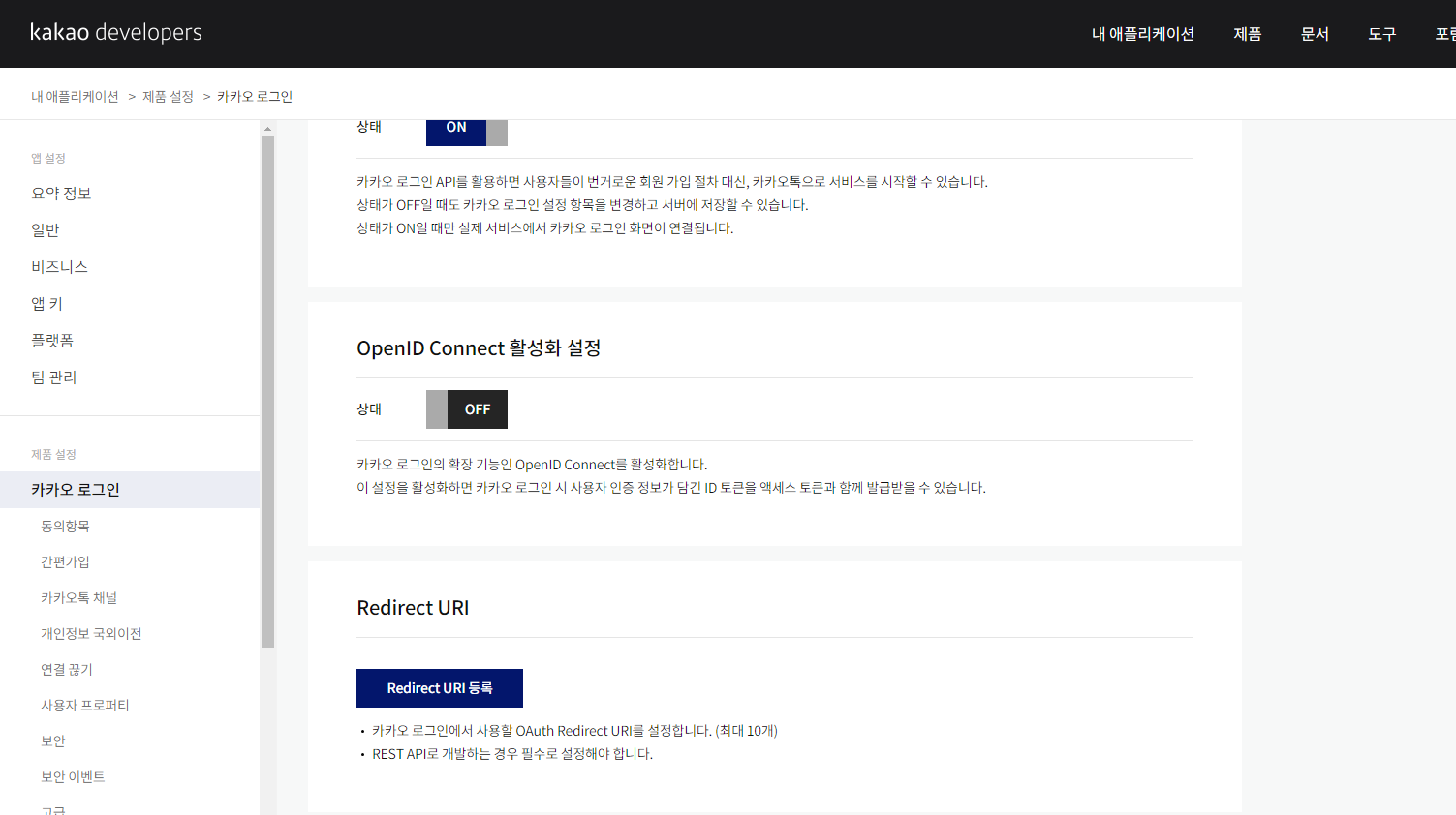 방금 수행했던 로그인 활성화 탭에서 제일 밑으로 내리면 Redirect URI탭이 보인다. 파란색의 Redirect URI 등록버튼을 눌러준다.