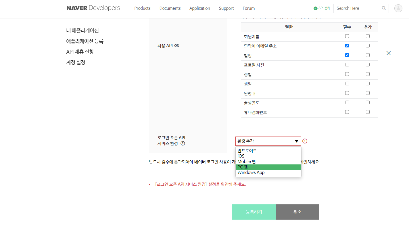 로그인 오픈 API 서비스 환경탭에서 환경추가를 누르고 PC웹을 선택해 준다.