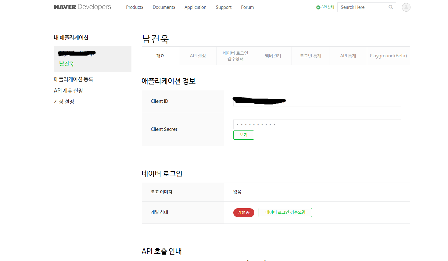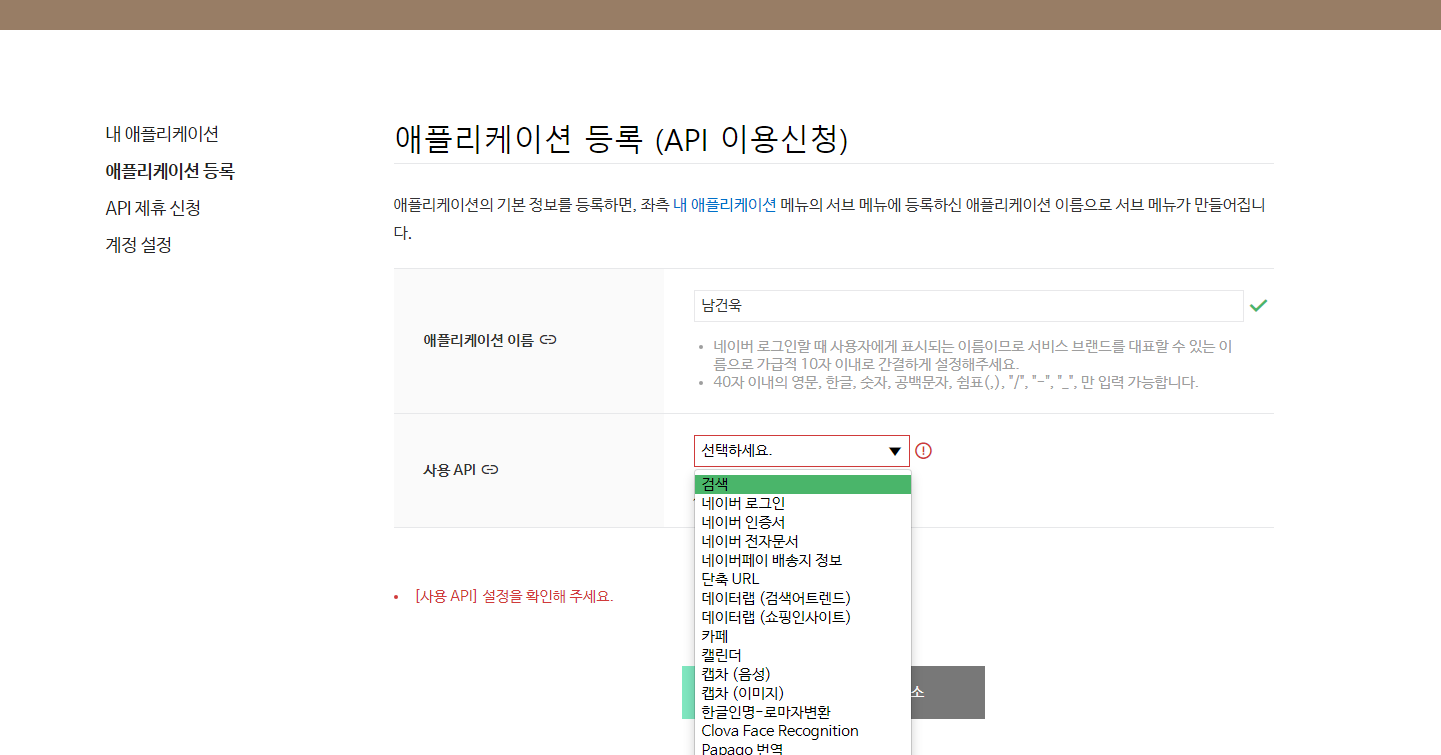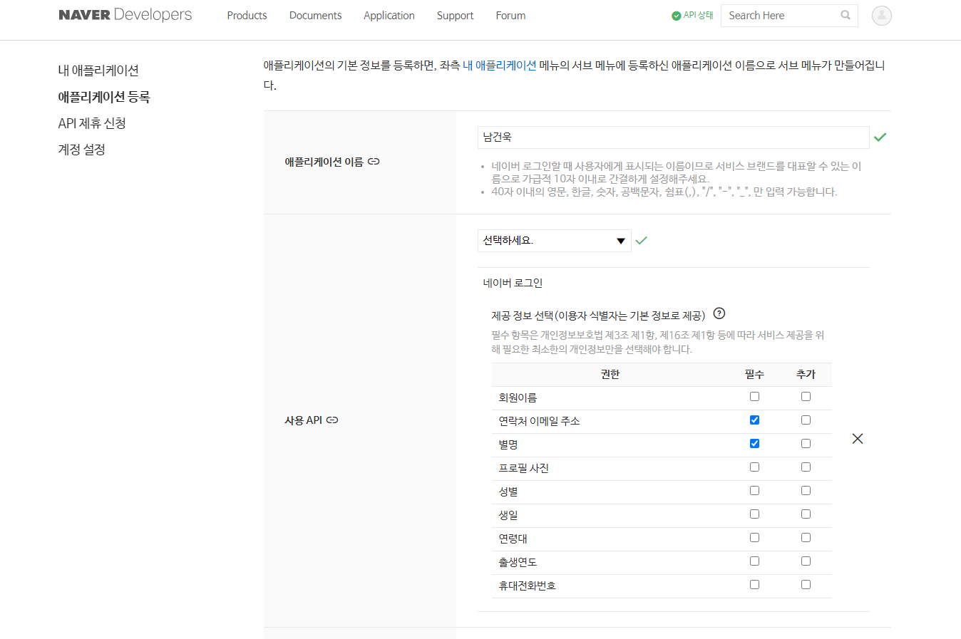 애플리케이션 이름을 작성하고 사용 API에서는 네이버 로그인을 선택해 준다.