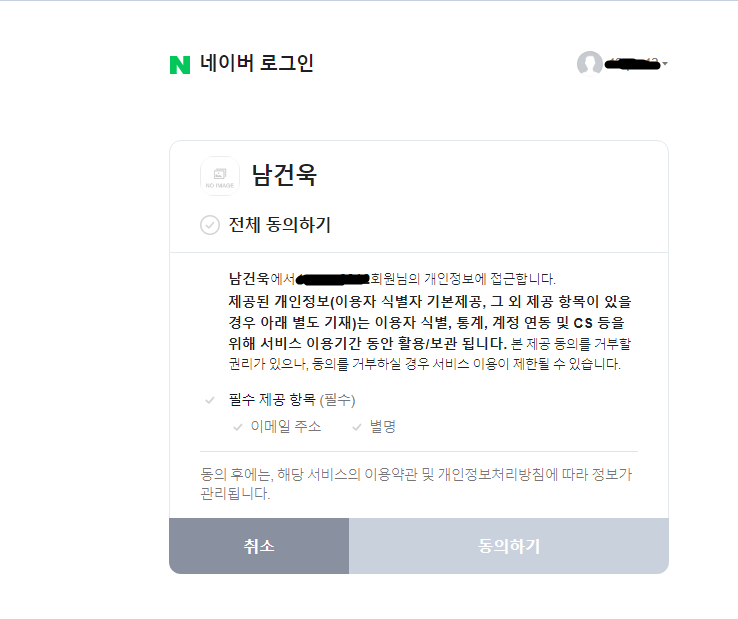 사용자의 정보중 필요한 정보를 체크해 준다. 나는 이메일, 별명만 가져오면 되기 때문에 두 개를 체크해 줬다.