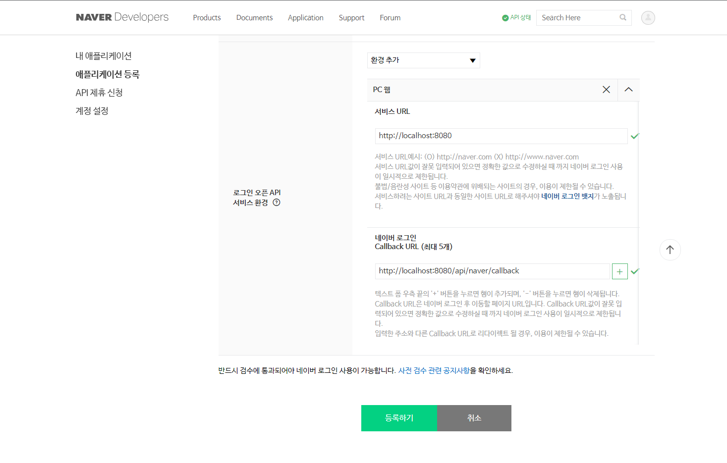 서비스 URL, 네이버로그인 Callback URL로 사용할 주소를 입력해 준다. 로컬에서 테스트할 것이기 때문에 localhost로 설정해 줬다. 그 뒤 등록하기를 눌러준다.