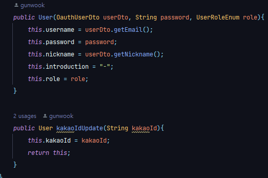 kakaoUser = new User(userDto, encodedPassword, UserRoleEnum.USER);