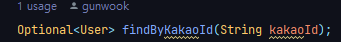 중복가입을 체크하기 위해 UserRepository에 kakaoId로 유저를 검색할 수 있도록 Optional형식으로 코드를 추가해 줬다.