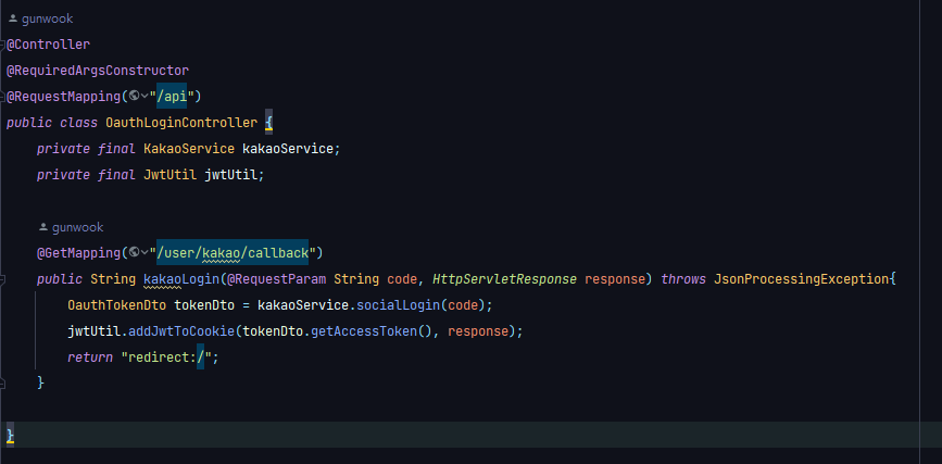 OauthTokenDto tokenDto = kakaoService.socialLogin(code);