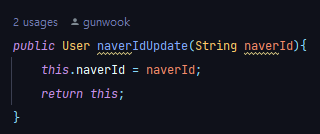 naverIdUpdate 메서드는 내가 설정해 둔 칼럼에 값을 추가할 수 있도록 만들어뒀다.