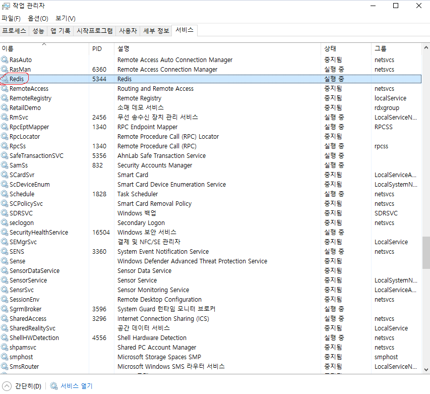 서비스 탭에 들어가서 Redis가 실행중이지 확인한다.