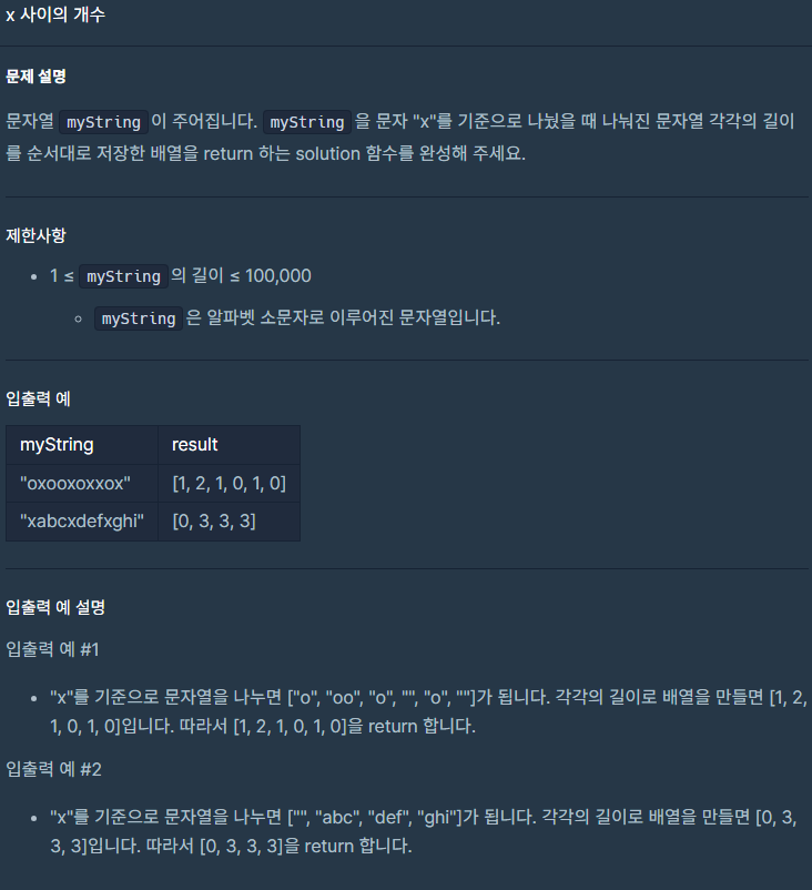 myString을 x를 기준으로 나눠줬고 최대수도 myString.length()를 사용해서 설정해 줬다. 그 뒤 splitString의 길이만큼의 크기를 갖는 answer를 생성해 줬다. answer안에는 splitString의 각 배열들의 길이를 대입해 주고 반환하였다.