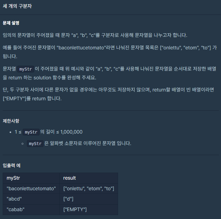 문자열 형식의 List를 하나 만들어줬다. 그 뒤 각각의 원소들을 ch에 넣어주고 비교했다. 만약 ch가 a, b, c 중 하나라면 조건에 걸리고 내부에서 한번 더 걸린다. end가 start보다 크다면 sub변수 안에 myStr을 start번째부터 end까지 넣어주고 list에 추가했다. 이때 start는 if가 한번 실행될 때 i+1로 해줬고, end는 전체반복문이 끝나기 전에 i+1을 해줬다. 그 뒤 end가 start보다 크다면 다시 한번 substring을 이용해서 자르고 list에 넣어줬다. 만약 list가 비어있으면 EMPTY를 반환하고 아니라면 toArray()를 사용하여 리스트를 배열로 변환하여 반환했다.