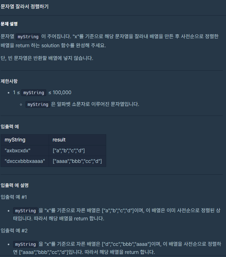 splitAnswer에 x를 기준으로 나눈 문자열을 배열형식으로 대입해 줬다. 그리고 list를 하나 만들어서 splitAnswer안에 있는 값이 비어있지 않다면 list에 추가해 줬다. 그 후 Collections.sort()를 이용해서 list를 오름차순으로 정렬해 준 뒤에 answer변수를 만들어서 list의 길이만큼 선언해 주고 toArray()를 사용해서 answer의 배열형식으로 list안의 값을 answer에 대입해 준 뒤 반환하였다.