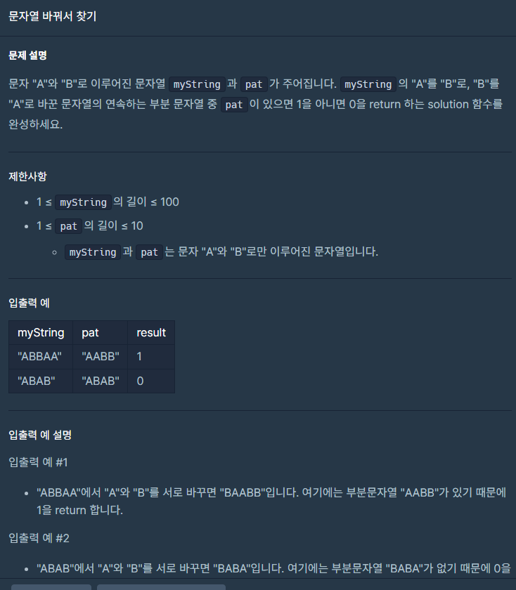 처음에 myString.replace('A', 'B').replace('B', 'A') 했다가 잘못 생각했단 걸 깨닫고 다시 작성했다. 앞에 말한 코드대로 하면 바뀐 B도 다시 A로 바뀌기 때문에 실행할 수 없다. 그래서 A는 X로 바꿔두고 B는 Y로 바꿔둔 뒤에 다시 X를 B, Y를 A로 바꿔줬다. 그 뒤에 contains를 사용해서 reString안에 pat이 포함되는지 확인한 뒤에 확인되면 answer에 1을 넣어주고, 아니면 그대로 0이 담긴 채로 반환될 것이다.