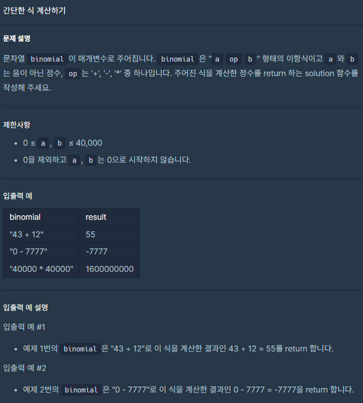 binomial 문자열을 공백을 기준으로 나눠서 리스트에 저장했다. 그리고 문자열이기 때문에 계산을 하기 위해 Integer.parseInt()를 사용해서 result [0], result [2]에 들어있는 문자열들을 정수형으로 변환했다. if문에서 result [1]에 들어있는 기호가 +일 때는 두 값을 더해주고, -일 때는 빼주고, 아니면 곱해주고 answer을 반환했다.