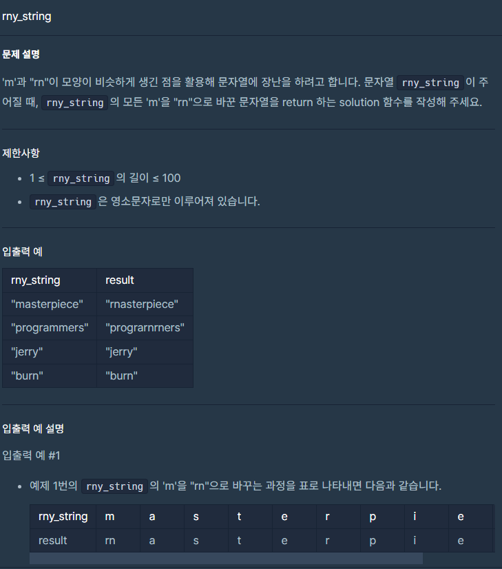 간단한 문제였다. replace를 사용하여 m이 들어가 있으면 rn으로 바꿔주었다. 그 후 반환하였다.