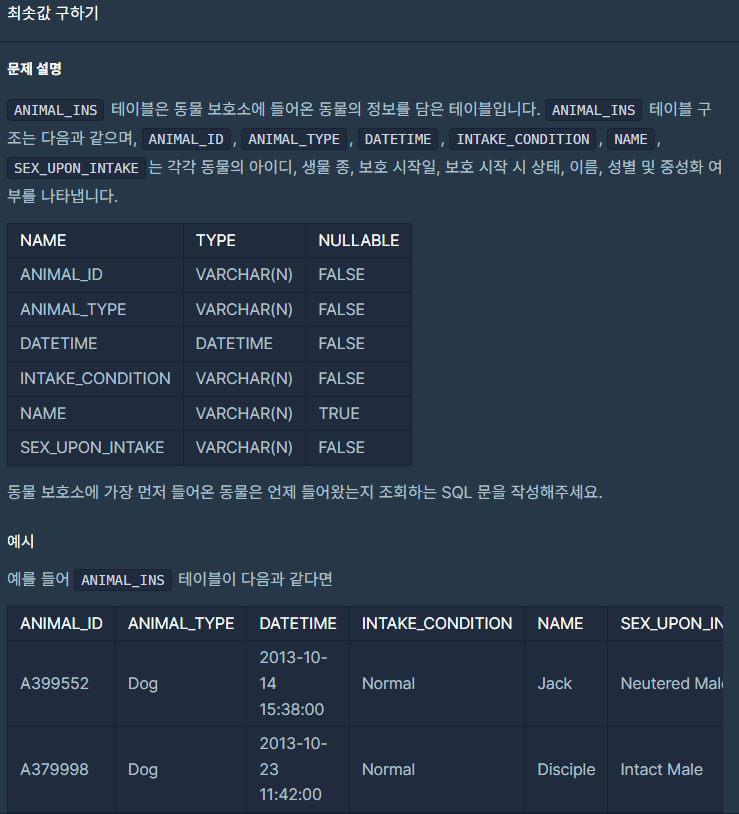 1. 최솟값 구하기 SELECT MIN(DATETIME) AS 시간 FROM ANIMAL_INS ANIMAL_INS 테이블에서 MIN옵션을 주고 DATETIME을 조회하였다. 가장 작은 값을 조회하고 별칭은 시간으로 주었다. 2. 고양이와 개는 몇 마리 있을까 SELECT ANIMAL_TYPE, COUNT(*) AS count FROM ANIMAL_INS GROUP BY ANIMAL_TYPE HAVING ANIMAL_TYPE IN ('cat', 'dog') ORDER BY ANIMAL_TYPE ANIMAL_INS 테이블에서 ANIMAL_TYPE과 개수를 조회하였다. 별칭은 count로 줬다. 그룹은 ANIMAL_TYPE으로 그룹핑해 주고 조건은 ANIMAL_TYPE이 cat, dog에 포함되는 것만 선택..
