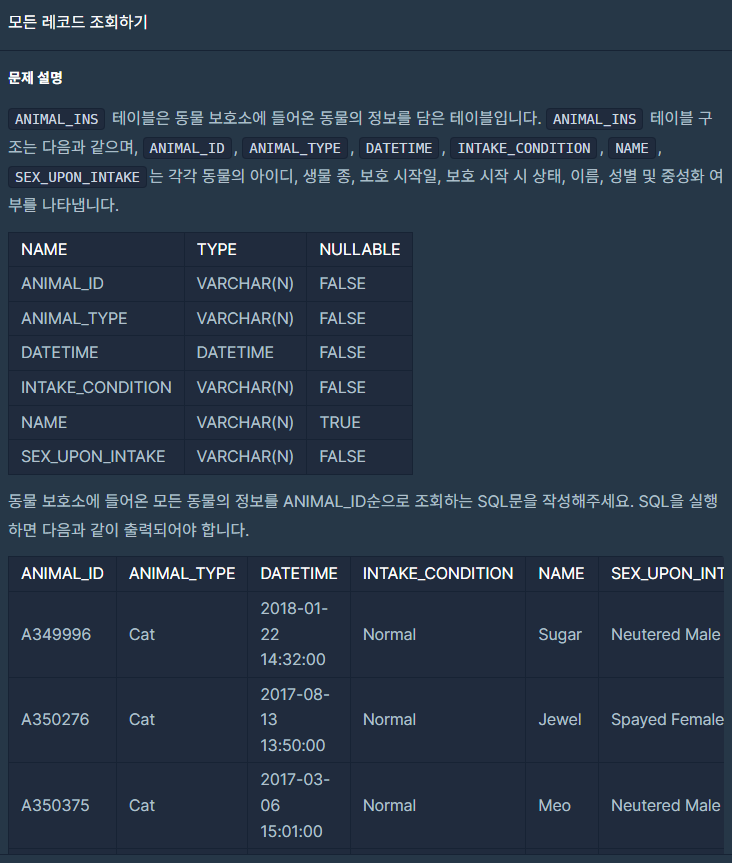 1. 모든 레코드 조회하기 SELECT * FROM ANIMAL_INS ORDER BY ANIMAL_ID ANIMAL_INS 테이블의 모든 정보를 조회하도록 했고 ORDER BY를 사용해서 ANIMAL_ID 순으로 정렬하였다. 2. 역순 정렬하기 SELECT NAME, DATETIME FROM ANIMAL_INS ORDER BY ANIMAL_ID DESC ANIMAL_INS 테이블에서 NAME, DATETIME을 조회했고 정렬은 ANIMAL_ID를 기준으로 내림차순으로 정렬하였다. 3. 아픈 동물 찾기 SELECT ANIMAL_ID, NAME FROM ANIMAL_INS WHERE INTAKE_CONDITION = 'Sick' ANIMAL_INS 테이블에서 ANIMAL_ID, NAME을 조회했고 조건은 ..