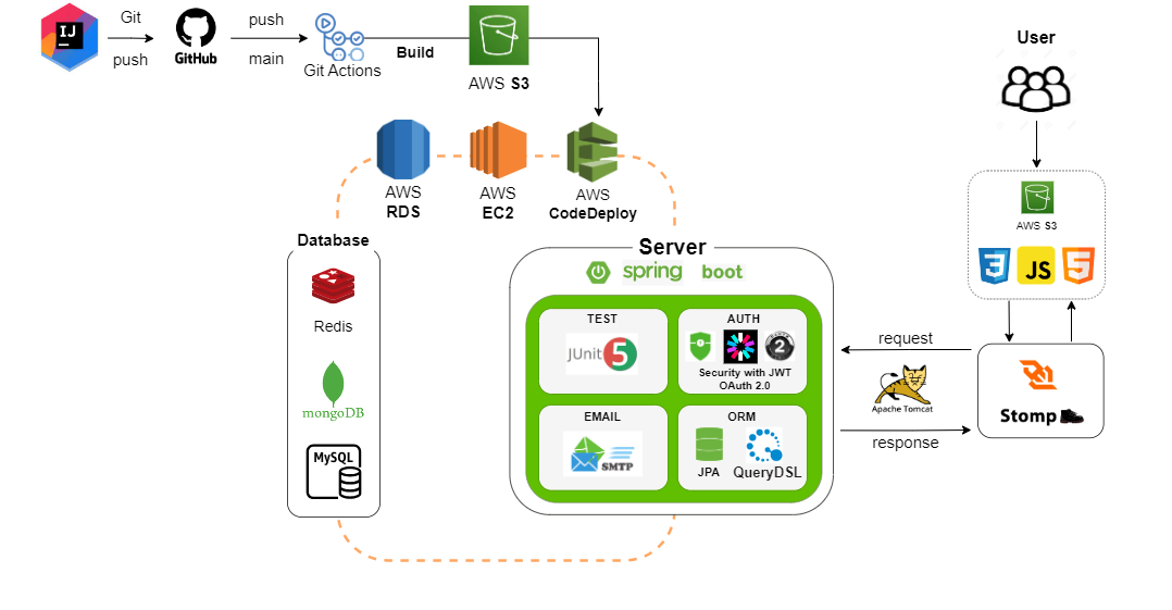 프로젝트 이름 : 코끼리 (코딩하는 사람끼리) 프로젝트 인원 : 4명(백앤드 개발자 4명) 프로젝트 기간 : 30일 프로젝트 내용 : 개발자 및 개발 공부를 하는 사람끼리 서로 정보를 공유하고 협업 프로젝트 팀을 구성해 사이트 내에서 다양한 협업 지원 기능을 이용할 수 있습니다. 개발 환경 Intellij JDK 17.0.7 Spring Boot Version 3.1.2 Gradle 8.2.1 서비스 아키텍처 프로젝트 구현 기능 회원가입(이메일 본인 인증) & 로그인 카카오, 네이버, 구글 소셜 로그인이 가능합니다. 회원가입 시, 이메일로 전송되는 인증 번호를 입력해야 가입이 가능합니다. 마이페이지 프로필을 수정하거나 회원 탈퇴가 가능합니다. 작성한 게시물 및 댓글 관리가 가능합니다. 백오피스 페이지 관..