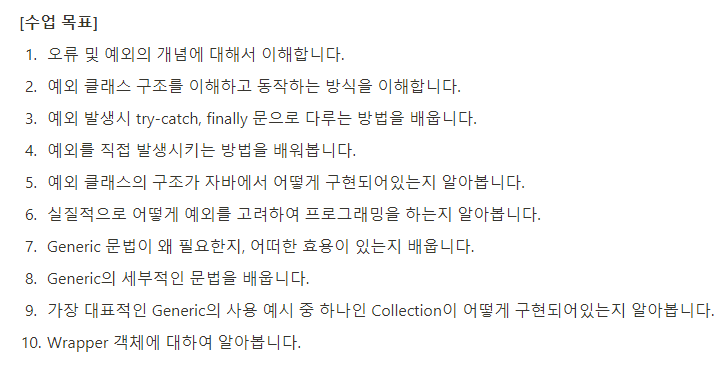 목표 수업목표이다. 이번수업에는 예외의 개념, 구조를 이해하고 Generic문법과 Wrapper객체에 대하여 배울 것이다. 오류&예외 오류와 예외의 차이점이다. 우선 오류는 일반적으로 회복이 불가능하다. 오류에 대처하는 법으로는 프로그램이 실행되고 어떠한 경우에 프로그램이 종료되었는지 로그를 체크해서 대응하는 방법이 있다. 예외는 일반적으로 회복이 가능한 문제이고, 컴파일에러와 런타임에러가 있다. 컴파일에러로는 간단히 문법이 틀리는 경우가 많기에 문법만 수정하면 간단하게 처리가 가능하다. 런타임에러는 문법적인 오류는 아니지만 프로그램이 실행도중 마주하는 오류를 뜻한다. try-catch & Finally 예시로 가져온 try-catch와 Finally를 사용한 코드이다. 먼저 try{}에서 위험한 메서드..